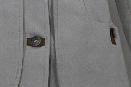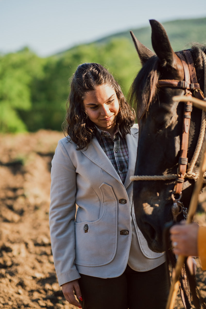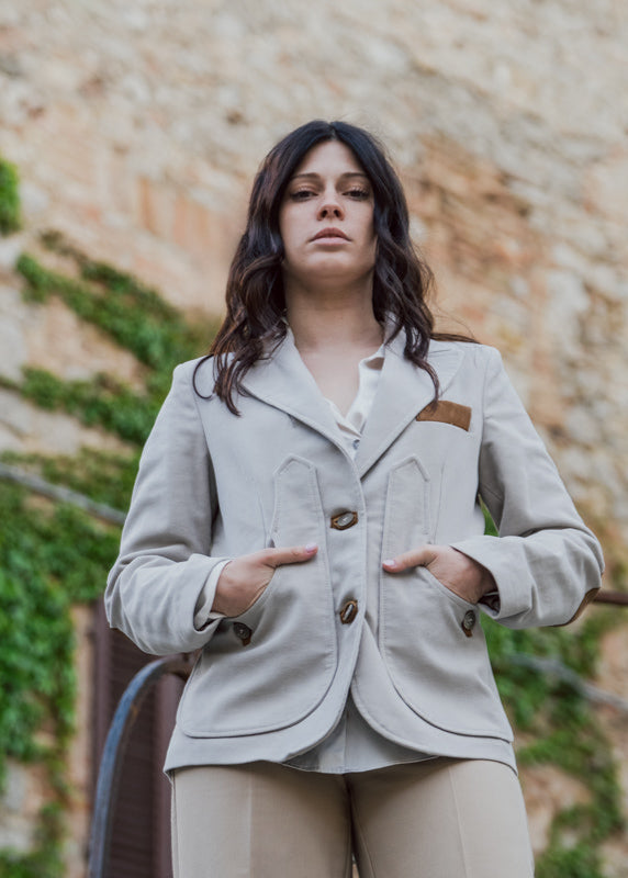 Jacket with a modern shape but which recalls ancient traditions with the typical Maremma pocket, screwed on the sides and with a slit at the back.